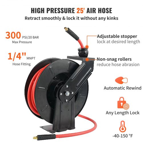 Air Hose Reel 3/8" x 25' Auto Rewind Hybrid Rubber Hose Retractable 300PSI